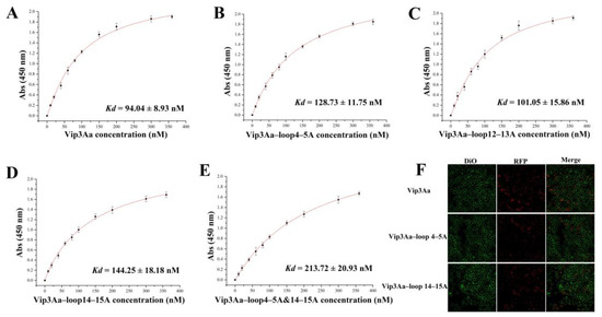 Binding analysis of Vip3Aa and its mutants to S. frugiperda BBMVs. Saturation binding of biotinylated Vip3Aa (A), Vip3Aa–loop 4–5A (B), Vip3Aa–loop 12–13A (C), or Vip3Aa–loop 14–15A (D) to S. frugiperda BBMVs. (E) Saturation binding of biotinylated Vip3Aa–loop4–5A&14–15A. (F) Confocal microscopy analysis of the entry of Vip3Aa or its mutants into Sf9 cells.