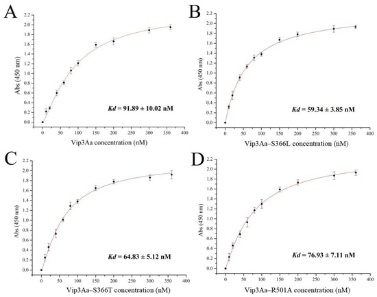 Our results suggested that the β4–β5 loop or β14–β15 loop in domain III is involved in the interaction between Vip3Aa and its receptors. Therefore, the binding of toxicity–enhanced Vip3Aa mutants to S. frugiperda BBMVs was measured by ELISA binding saturation assays. As shown in Figure 5, the equilibrium dissociation constants (Kd) of Vip3Aa binding to BBMVs, Vip3Aa–S366L, Vip3Aa–S366T, and Vip3Aa–R501A were 91.89 ± 10.02 nM, 59.34 ± 3.85 nM, 64.83 ± 5.12 nM, and 76.93 ± 7.11 nM, respectively. These results indicate that the toxicity–enhanced Vip3Aa mutants (except Vip3Aa–R501A) have greater binding with S. frugiperda BBMVs than Vip3Aa.