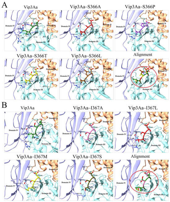Contact analysis between residues by chimera X. (A) Vip3Aa and mutants of S366. (B) Vip3Aa and mutants of S367. Alignment indicates the result of comparison of β4–β5 loop in the structure of the Vip3Aa protein with that of the mutant proteins. The β4–β5 loop in Vip3Aa and its mutants were labeled with different colors. Blue: domain III; Purple: domain IV; Red circle: β4–β5 loop.