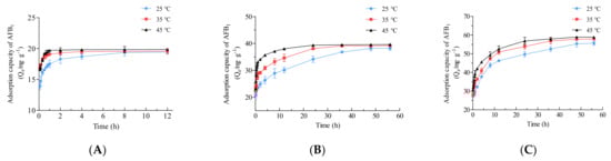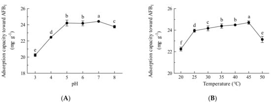 | Temperature (°C) | Time (h) | Adsorption Capacity for AFB1 (mg·g−1) * |