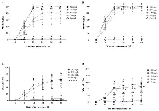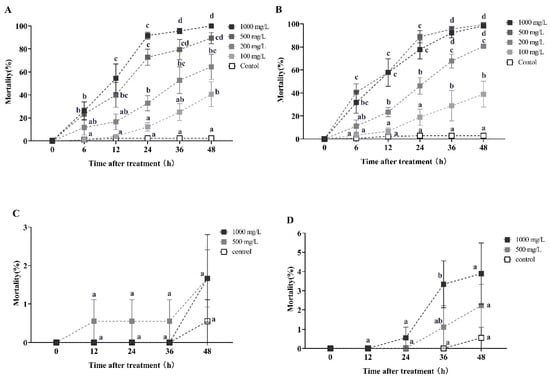 This study examines the horizontal transfer of azadirachtin toxicity in red imported fire ants. The data presented in the figure are expressed as the mean ± standard error. (A,C) represent the first-round and second-round toxicity transfer, respectively, with a donor-workers to the recipient-workers ratio of 1:10. Similarly, (B,D) represent the first-round and second-round toxicity transfer with a donor-workers to recipient-workers ratio of 1:5. In the figure, identical letters indicate no significant difference (p > 0.05) as determined by the Kruskal–Wallis test.