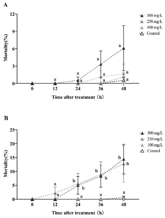 This study examines the horizontal transfer of veratramine toxicity in red imported fire ants. The data presented in the figure are expressed as the mean ± standard error. (A,B) represent the first-round toxicity transfer with donor-workers to recipient-workers ratios of 1:10 and 1:5, respectively. In the figure, identical letters indicate no significant difference (p > 0.05) as determined by the Kruskal–Wallis test.