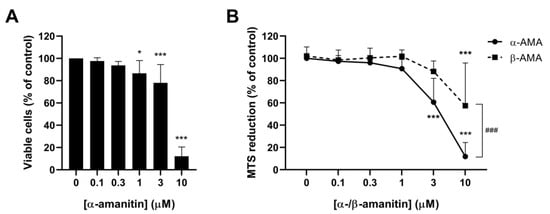 The effects of α-amanitin on cell viability were investigated by trypan blue exclusion and a 3-(4,5-dimethylthiazol-2-yl)-5(3-carboxymethoxyphenyl)-2-(4-sulfopheny)-2H-tetrazolim (MTS) assay. In the trypan blue exclusion assay, α-amanitin concentration-dependently decreased the number of viable cells after 72 h of exposure (Figure 1A). This effect was significant for 1 μM (p < 0.05), 3 μM, and 10 μM α-amanitin (p < 0.001). The average percentage of viable cells remaining compared to the control was 87 ± 11% for 1 μM α-amanitin, 78 ± 16% for 3 μM α-amanitin, and 12 ± 8% for 10 μM α-amanitin. Preliminary experiments showed a maximum effect of α-amanitin on cell viability after 72 h of exposure. No significant effects of exposure to α-amanitin concentrations up to 3 µM were observed after 24 and 48 h. The maximum effect of α-amanitin was comparable to the effect of cyclophosphamide (10 mg/mL), which was used as a positive control. The results of the MTS assay show a similar effect to that observed for the trypan blue exclusion assay (Figure 1B). Both α-amanitin and β-amanitin decreased MTS reduction in a concentration-dependent fashion. However, the effect of α-amanitin was more significant than that of β-amanitin, especially at the highest concentrations. At 10 μM α-amanitin, only 12 ± 13% MTS reduction remained, while exposure to β-amanitin at this concentration resulted in 58 ± 38% MTS reduction (p < 0.001).