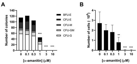α-Amanitin reduces viability of primary CD34+ stem cells. (A) Total number of colonies with a subdivision in the 5 different colonies observed in the CFU assay (n = 3). BFU-E: burst-forming unit-erythroid. CFU-E: colony-forming unit-erythroid. CFU-M: colony-forming unit-macrophage. CFU-GM: colony-forming unit-granulocyte/macrophage. CFU-G: colony-forming unit-granulocyte; (B) the cell number (million cells) of CD34+ stem cells treated with increasing concentrations of α-amanitin (n = 2–4). ** p < 0.01, *** p < 0.001 compared to the control (0 µM).