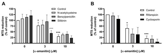 Commonly used antidotes do not prevent α-amanitin induced toxicity. Influence of (A) N-acetylcysteine (1 mM), benzylpenicillin (1 mM), silibinin (30 μM), (B) rifampicin (10 μM), and cyclosporin (3 μM) on α-amanitin-induced toxicity in HL60 cells. Data represent mean ± SD of 3–9 experiments. * p < 0.05, *** p < 0.001 compared to the control (0 μM), +++ p < 0.001 compared to α-amanitin (3 µM).
