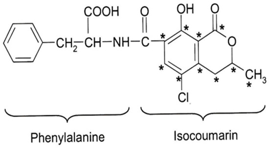OTA labelled 14C in the isocoumarin moiety by [1,2-14C]-acetate in an A. ochraceus fermentation leads to incorporation of label in positions marked with *, except for the peptide bond carbon, derived from methionine.