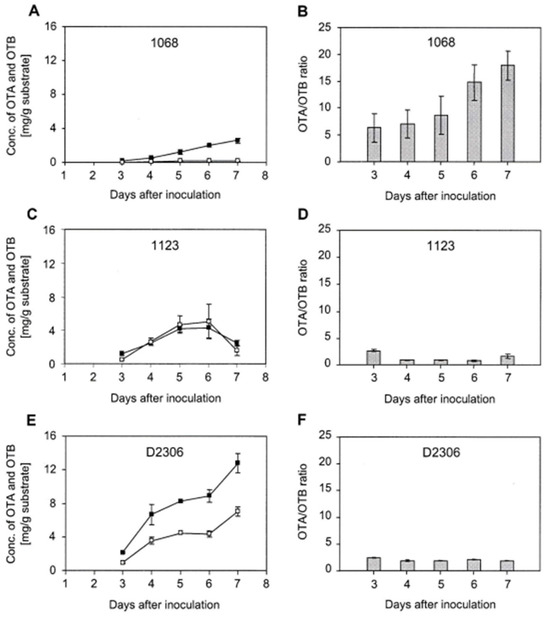 The highest yield of OTA was produced by isolate D2306, commencing prior to the first sampling on day 3 following inoculation. The concentration of OTA increased gradually over time, reaching a maximum of 12.8 mg/g substrate on day 7 (Figure 2E), and the OTA/OTB ratio remained around two (Figure 2F).