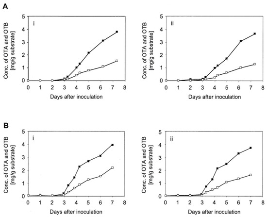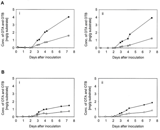Early ochratoxin production of A. ochraceus isolate 1068 displayed in two experiments (A,B), each with two replicates (i,ii). The solid black blocks represents ochratoxin A (OTA). The hollow blocks represent ochratoxin B (OTB).