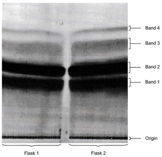 Second 14C-labelling experiment for ochratoxins: flasks 1 and 2. Autoradiograph of PLC plate following separation of bicarbonate-soluble extracts from two replicate fermentation flasks. Chromatography solvent: toluene/ethyl acetate/formic acid (5:4:1). Band 1, OTB; Band 2, OTA.