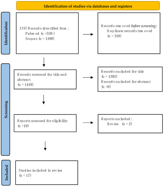 This systematic review was performed following the Preferred Reporting Items for Systematic Reviews and Meta-Analysis (PRISMA) flow diagram (https://www.bmj.com/content/339/bmj.b2700, accessed on 4 May 2023). The PRISMA flow diagram is presented in Figure 1 [23].