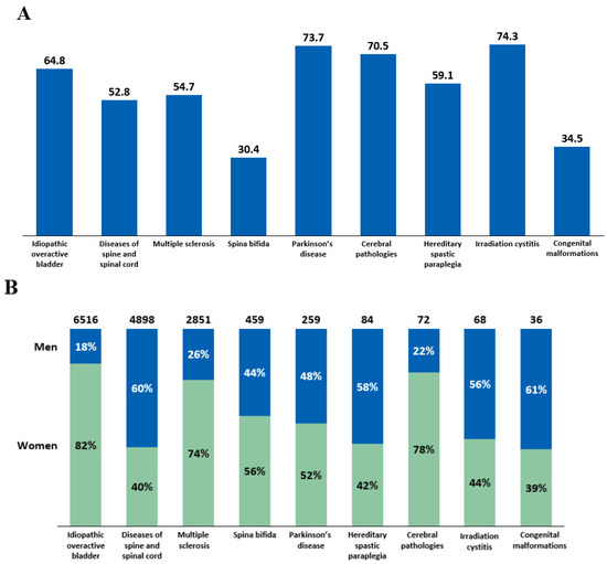 (A) Mean age of patients receiving intradetrusor botulinum toxin type A (BoNT-A) injections in 2022 according to etiology. (B) BoNT-A treatment rates in men and women in 2022 categorized by etiology.