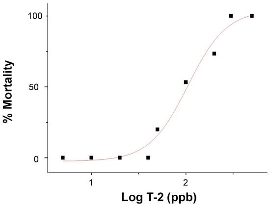 Dose-response curve of lethality (i.e., % mortality), in relation to the log exposure concentration of T-2 (in ppb), in 72–96 hpf zebrafish embryos.