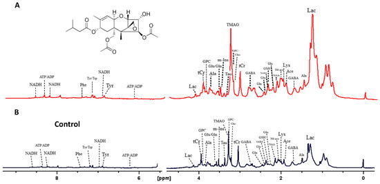 High-resolution MAS 1H-NMR spectra of zebrafish embryos exposed to the T-2 toxin (A), and control embryos exposed to ISO medium only (B).