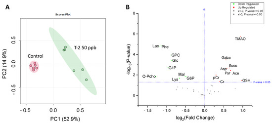 Principal components analysis (PCA) showing a significant difference in the metabolite concentrations of 50 ppb T-2-treated (green) versus untreated, i.e., solvent-only, control (pink) embryos of zebrafish (A), and volcano plot showing the log fold-change compared to the control embryos, and corresponding −log p-values, for metabolites identified and measured by HRMAS NMR. (B) As indicated, a significant change is reported for a p-value < 0.05. For a complete list of the metabolites measured, see Table 1. Abbreviations: Ace = acetate; Asp = aspartate; Cr = creatine; pCr = phosphocreatine; GABA = g-aminobutyric acid; Glc = glucose; GSH = glutathione; GPC = glycerophosphocholine; G1P = glucose-1-phosphate; G6P = glucose-6-phosphate; Lac = lactate; Lys = lysine; Mal = malate; O-PCho = O-phosphocholine; Phe = phenylalanine; Pyr = pyruvate; Succ = succinate; TMAO = trimethylamine oxide.