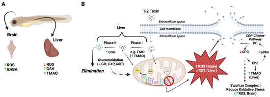 Proposed differential role of oxidative stress, detoxification pathways and disruption of cell membranes in T-2 toxicity in the brain and liver of zebrafish embryos. (A) Increased ROS was observed in the brain of T-2-exposed embryos, with an attending increase in γ-aminobutyric acid (GABA), presumably reflecting increased release and binding, and decreased uptake, whereas ROS was undetectable in the liver of T-2-exposed embryos, likely due to decreased mitochondrial energy production via oxidative phosphorylation. At the same time, the increase in both trimethylamine oxide (TMAO) and glutathione (GSH) presumably reflects increased phase I (i.e., flavin-containing monooxygenases [FMO]) and phase II detoxification pathways in the liver, respectively. (B) Increased phase II detoxification by glucuronidation, as previously reported [33], leads to elimination of T-2 in the liver, with a concomitant reduction in the pool of glucose (Glc) and related metabolites, i.e., glucose-1-phosphate (G1P) and glucose-6-phosphate (G6P), for mitochondrial energy production. Whereas ROS were decreased in liver, it is proposed that the increased ROS in the brain leads to the disruption of cell membranes, as suggested by the decreased levels of glycerophosphocholine (GPC) and O-phosphocholine (pChol), as part of the CDP-choline pathway for phosphatidylcholines (PC). It is recognized that GPC can stabilize complex I of the electron transport chain of oxidative phosphorylation, and reduced GPC levels may, accordingly, further explain the increased ROS in the brain region via “leakage” of electrons to O2. In the liver, increased production of TMAO may also deplete the levels of choline (Cho), as a precursor, which would further reduce the pools of GPC and pChol. Abbreviations for the metabolites: Ace = acetate; Asp = aspartate; Cr = creatine; pCr = phosphocreatine; GABA = g-aminobutyric acid; Glc = glucose; GSH = glutathione; GPC = glycerophosphocholine; G1P = glucose-1-phosphate; G6P = glucose-6-phosphate; Lac = lactate; Lys = lysine; Mal = malate; O-PCho = O-phosphocholine; Phe = phenylalanine; Pyr = pyruvate; Succ = succinate; TMAO = trimethylamine oxide.