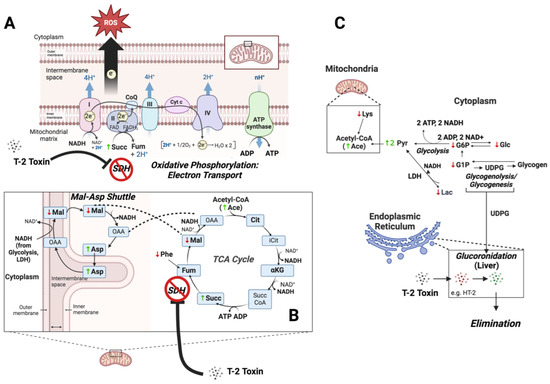 Proposed role of impaired energy metabolism in T-2 toxicity. Known to inhibit succinate dehydrogenase (SDH), the T-2 toxin impairs both complex II of the electron transport chain of oxidative phosphorylation (A), and a key step in the tricarboxylic acid (TCA) cycle (B), as suggested by the increase in succinate (Succ). Dysfunction in the electron transport chain is, in turn, associated with the increases and decreases in ROS observed in the brain and liver of exposed zebrafish, respectively (see Figure 5). A concomitant increase in the malate/aspartate shuttle, as reflected by decreased malate (Mal) and increased aspartate (Asp), compensates for impaired mitochondrial energy production by increasing the transport of cytoplasmic NADH from glycolysis and other pathways, e.g., lactate dehydrogenase (LDH), into mitochondria. Upstream of the impairment of these energy-generating pathways, decreased levels of glucose (Glc) and the associated metabolites, glucose-1-phosphate (G1P) and glucose-6-phosphate (G6P), reflect a compensatory increase in their catabolism to generate ATP via substrate-level phosphorylation (e.g., glycolysis), as well as possible shunting toward glucuronidation via UDP-glucose (UDGP) for phase II elimination of T-2 and possible phase I metabolites, e.g., HT-2, in the endoplasmic reticulum (C). Concurrent increases in pyruvate (Pyr) and acetate (as Acetyl CoA) reflect, in turn, reduced flux into mitochondrial pathways (i.e., TCA cycle) due to inhibition of SDH. Finally, decreased levels of essential amino acids, phenylalanine (Phe) and lysine (Lys), reflect increased catabolism toward compensatory generation of fumarate (Fum), as part of the TCA cycle, and acetyl CoA for subsequent entry into the TCA cycle, respectively.