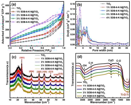 (a) The adsorption/desorption isotherms. (b) The pore size distribution maps of the TiO2 and SDB−6−K−9@TiO2 composites. (c) The XRD patterns. (d) The FTIR diagrams of the TiO2 and SDB−6−K−9@TiO2 composites.