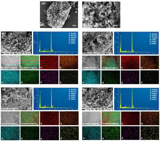 The apparent structural morphology of the TiO2 and SDB-6-K-9@TiO2 composite is shown in Figure 2. As shown in Figure 2a, the TiO2 prepared via hydrothermal synthesis presented an irregular spherical granular shape. Figure 2b–e indicates that TiO2 was uniformly supported on the surface of SDB-6-K-9. TiO2 particles displayed good dispersibility and particle shape retention. However, local TiO2 particle aggregation was also observed to some extent [32]. The elemental composition of the SDB-6-K-9@TiO2 composites was analyzed via EDS, and it confirmed the presence of primarily C, O, and Ti. Compared with the different addition SDB-6-K-9 amounts, the relative C content in the EDS spectra of the SDB-6-K-9@TiO2 composites increased. The dominant elements in TiO2 were Ti and O, indicating that TiO2 was successfully loaded onto the SDB-6-K-9 surface. The presence of C, O, and Ti during EDS mapping corresponded with the uniform distribution on the SDB-6-K-9@TiO2 composite surfaces.