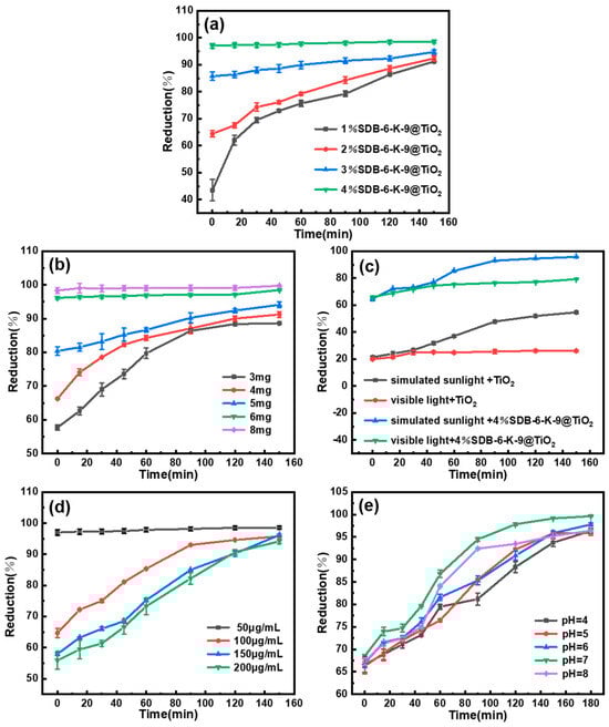 The photocatalytic amount is a crucial factor affecting photocatalysis. As shown in Figure 4b, at a 4%SDB-6-K-9@TiO2 dose of 3 mg–8 mg, adsorption differences were evident in dark conditions. The adsorption increased at higher photocatalytic doses, probably because the abundant active sites on the surface increased at a higher 4%SDB-6-K-9@TiO2 dosage, promoting its adsorption effect. In the same irradiation conditions, the reduction ranged from 88.62% to 98.49% when the photocatalytic dosage increased from 3 mg to 6 mg. However, an excessive photocatalytic quantity caused TiO2 aggregation on the SDB-6-K-9 surface, affecting the porosity and reducing the photocatalytic activity. Therefore, 6 mg 4%SDB-6-K-9@TiO2 was determined as the optimal photocatalytic amount and selected for further photocatalytic performance tests.