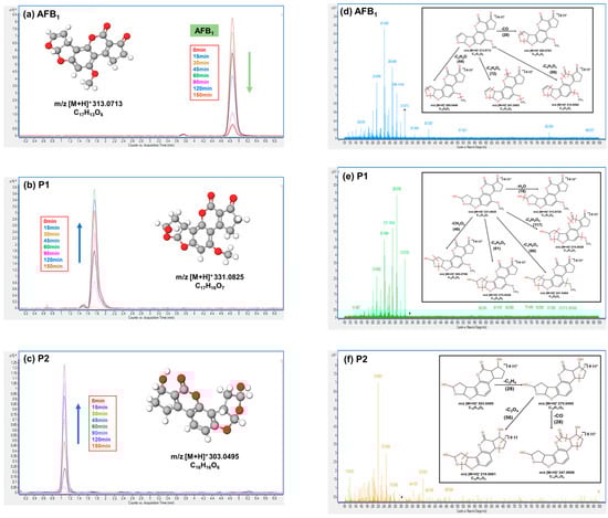 As shown in Figure 5d–f, the molecular weights of the three substances are AFB1 (m/z 313), P1 (m/z 331), and P2 (m/z 303). The measured molecular core of AFB1 is consistent with its actual molecular weight, confirming that the two newly generated degradation products are P1, with a molecular weight of 331, and P2, with a molecular weight of 303. To further identify the structures of these degradation products, AFB1 and the two degradation products were analyzed using UHPLC-Q-TOF-MS. The molecular nuclear ratio of the three substances were selected as the precursor ions, and secondary mass spectrometry was performed with appropriate collision energies. The MassLynx Version 4.1 software calculated the precision molecular nuclear ratio, the molecular formula with the highest match, the error, the double bond equivalents (DBE), and the i-FIT (Norm) match factor. The results show that the differences between the exact molecular masses of the three substances and their theoretical values were 0.3, 2.1, and −0.3 ppm, respectively, all within the internationally accepted standard of 5 ppm. The DBE values were 10.5, 12, and 11, with an i-FIT (Norm) value of 0 for all substances. Additionally, the molecular weight of AFB1 (313.0713) and its molecular formula (C17H13O6) as calculated by the software were consistent with its actual molecular weight (313.0712) and molecular formula (C17H13O6). Similarly, for P1, the molecular weight (331.0825) and molecular formula (C17H15O7) calculated by the software closely matched the actual values (331.0818 and C17H15O7). For P2, the molecular weight (303.0495) and molecular formula (C16H15O6) were also consistent with the actual values (303.0496 and C16H15O6). These results provide strong evidence for the high reliability of the molecular weights and formulas determined by the instrument.