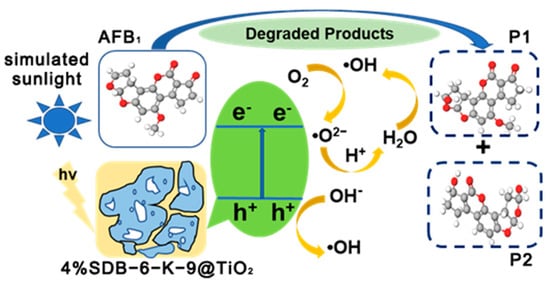 The potential photocatalytic oxidation mechanism of AFB1 via 4%SDB-6-K-9@TiO2 in simulated sunlight was postulated in Figure 6 in accordance with the results of the tests. The excited electrons produced conduction band electrons (e−) and valence band h+ when the 4%SDB-6-K-9@TiO2 was exposed to light. The photogenerated electrons reacted with O2 to generate O2•− and •OH, while the h+ on the surface of the 4%SDB-6-K-9@TiO2 interacted with hydroxyl ions (OH−) to directly generate •OH. Some of the h+ and •OH oxidized the AFB1 adsorbed on the catalyst surface, which was consistent with previous reports [41,43,44].