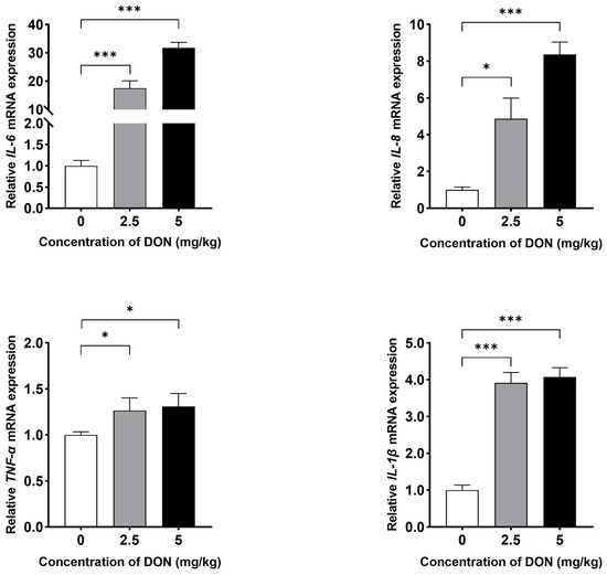 Compared to the control group, DON treatment triggered inflammation in the spleens of mice. As illustrated in Figure 1, stimulation with DON at doses of 2.5 or 5 mg/kg BW significantly increased IL-6, IL-8, IL-1β, and TNFα expressions (p < 0.05), indicating a dose-dependent inflammatory response in mouse spleen.