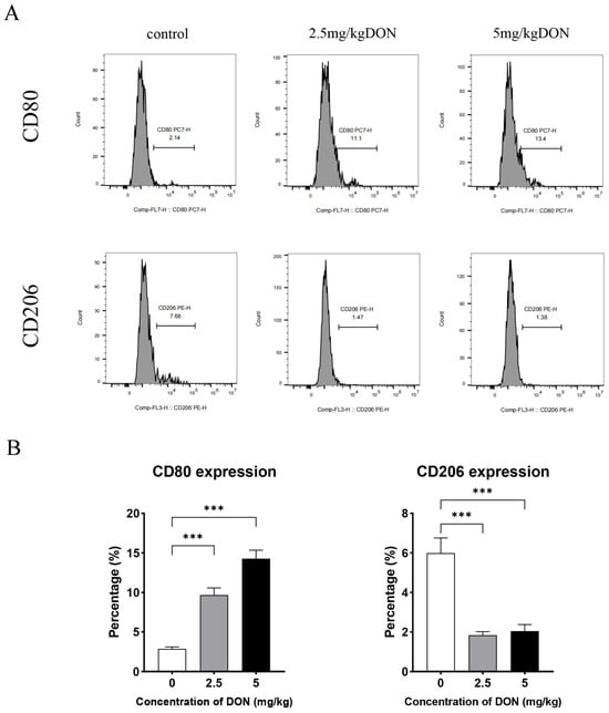 The phenotypic switch in macrophage polarization in the spleens of DON-treated mice was analyzed using flow cytometry. As shown in Figure 2, DON significantly increased the proportions of M1 macrophages (CD80-positive) in a dose-dependent manner, while noticeably decreasing the proportion of M2 macrophages (CD206-positive) in the total splenic macrophage population. These findings suggest that DON stimulation induces the polarization of mouse splenic macrophages to the M1 phenotype.