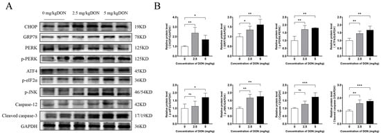 As illustrated in Figure 3, several classic markers of the PERK/ATF4 pathway of the UPR were detected, including CHOP, GRP78, PERK, p-PERK, ATF4, p-eIF2α, p-JNK, and Caspase-12. DON at doses of 2.5 or 5 mg/kg BW significantly increased the protein expression levels of CHOP, GRP78, ATF4, p-JNK, and p-PERK in mouse spleen compared to the control group (p < 0.05). However, the expressions of p-eIF2α and Caspase-12 were only significantly enhanced at the dose of 5 mg/kg BW (p < 0.05). Additionally, DON at both doses significantly elevated cleaved caspase-3 expression, a key marker of apoptosis, in mouse spleen.