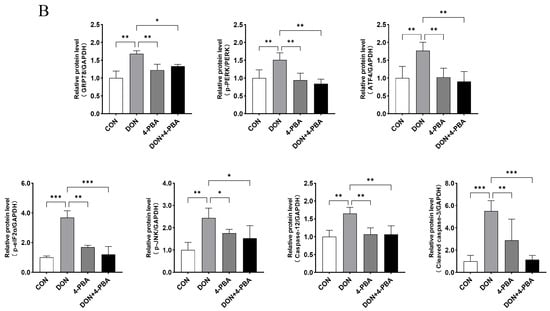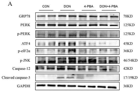 To investigate the function of ER stress in DON-induced tissue damage, a separate experiment was conducted. Mice were randomly divided into four groups: CON, DON, 4-PBA, and DON+4-PBA (n = 4 per group). Mice received an intraperitoneal injection of 500 mg/kg BW 4-PBA and were subsequently treated with either PBS or 5 mg/kg BW DON [58]. Samples were collected 3 h after DON treatment.