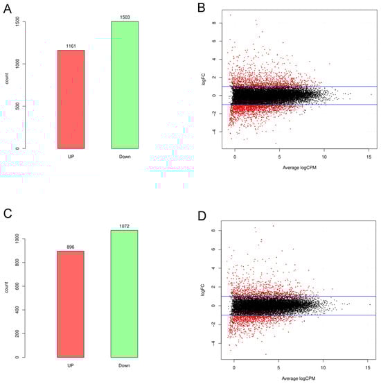 Expression changes in lncRNAs and mRNAs in splenic tissue after DON stimulation, including differentially expressed (DE) mRNAs (A) and DE lncRNAs (C). MA plot of DE mRNAs (B) and DE lncRNAs (D).