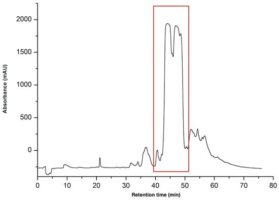 Preparative HPLC chromatogram of Naja anchietae venom using gradient 0–70% for 70 min at 214 nm a C18 100 Å column. Fractions were collected at intervals of every 0.1 min, corresponding to a flow rate of 6 mL per minute. The region containing the active peptides is highlighted with a red square in the figure. These peptides were eluted between 40 and 52 min, which corresponds to an elution percentage of approximately 30%.