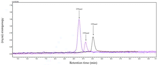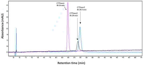 Three peptides were isolated from this region (Figure 1), designated as CTNanc1, CTNanc2, and CTNanc3. These peptides were characterized using analytical RP-HPLC under a gradient of 20–50% solvent B over 60 min at a flow rate of 1 mL per minute. Detection was carried out at wavelengths of 214 nm and 280 nm. The profile of the homogeneous products is presented in the Figure 2.