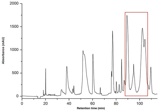 Preparative HPLC chromatogram of Naja anchietae venom using gradient 20–60% for 120 min at 214 nm on a C18 300 Å column. Fractions were collected at intervals of every 0.1 min, corresponding to a flow rate of 6 mL per minute. The region containing the active peptides is highlighted with a red square in the figure. These peptides were eluted between 80 and 120 min, which corresponds to an elution percentage of approximately 37%.