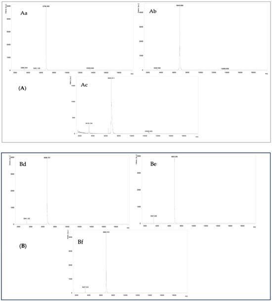 Active peaks isolated and purified from the venoms of Naja anchietae and Naja senegalensis were characterized using analytical high-performance liquid chromatography (HPLC). Homogeneous molecules identified via HPLC were subsequently analyzed by matrix-assisted laser desorption/ionization time-of-flight (MALDI-TOF) mass spectrometry. This analysis revealed that the peaks designated as CTNsen1 (Aa), CTNsen2 (Ab), CTNsen3 (Ac), CTNanc1 (Bd), CTNanc2 (Be), and CTNanc3 (Bf) had molecular weights of [M + H] 6766.4 Da, 6849.6 Da, 6840.8 Da, 6688.7 Da, 6850.4 Da, and 6862.9 Da, respectively, as shown in Figure 7.