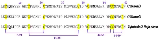 Comparative analysis of CTNsen3, CTNanc3, and Cytotoxin 2 from Naja nivea sequences. The differences are in bold and cysteines forming disulfide bridges are highlighted in yellow.