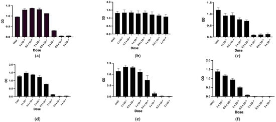 Antiproliferative activity of CTNsen1 (a), CTNsen2 (b), CTNsen3 (c), CTNanc1 (d), CTNanc2 (e), and CTNanc3 (f) from Naja senegalensis and Naja anchietae, respectively. These results were obtained using an MTT assay on T98G cells after 72 h of treatment with a series of increasing concentrations (1 × 10−⁷, 0.5 × 10−6, 1 × 10−⁶, 0.5 × 10−5, 1 × 10−⁵, 0.5 × 10−4, and 1 × 10−⁴ Molar) of peptides. The OD was measured at 570 nm.