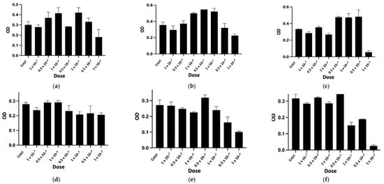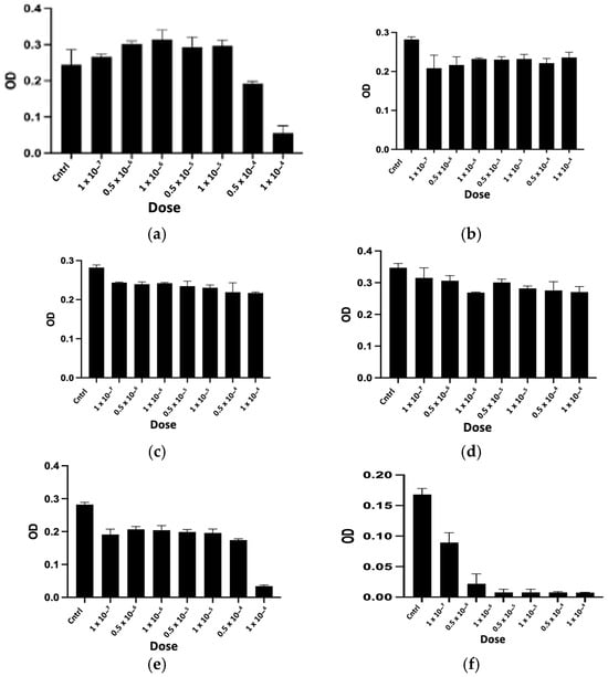 Antiproliferative activity of CTNsen1 (a), CTNsen2 (b), CTNsen3 (c), CTNanc1 (d), CTNanc2 (e), and CTNanc3 (f) from Naja senegalensis and Naja anchietae respectively. These results were obtained using an MTT assay on U251 cells after 72 h of treatment with a series of increasing concentrations (1 × 10−⁷, 0.5 × 10−6, 1 × 10−⁶, 0.5 × 10−5, 1 × 10−⁵, 0.5 × 10−4, and 1 × 10−4 Molar) of peptides. The OD was measured at 570 nm.