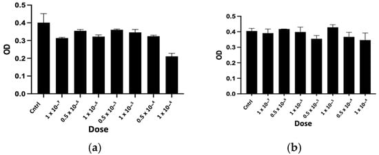 Antiproliferative activity of CTNsen1, CTNsen2, CTNsen3, CTNanc1, CTNanc2, and CTNanc3 from Naja senegalensis (b) and Naja anchietae (a), respectively. These results were obtained using an MTT assay on MCF7 cells after 72 h of treatment at 4 µg and 20 µg of peptide. Na and Ns here were used as a positive control at two concentrations (3 µg and 15 µg). The OD was measured at 570 nm.