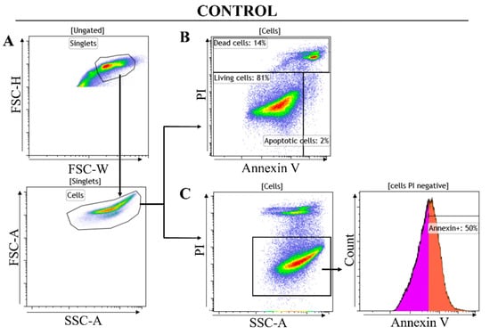 Flow cytometry gating strategy: representative example using untreated U87 cells. Doublets and debris are excluded (A); the first gating strategy identifies living cells (PI-negative and Annexin V-negative), apoptotic cells (Annexin V-positive and PI-negative), and dead cells (Annexin V-positive and PI-positive) (B); the second gating assesses the intensity of Annexin V fluorescence and the percentage of Annexin V-positive cells, Annexin V-negative and positive cell subsets are colored in pink and orange, respectively (C).