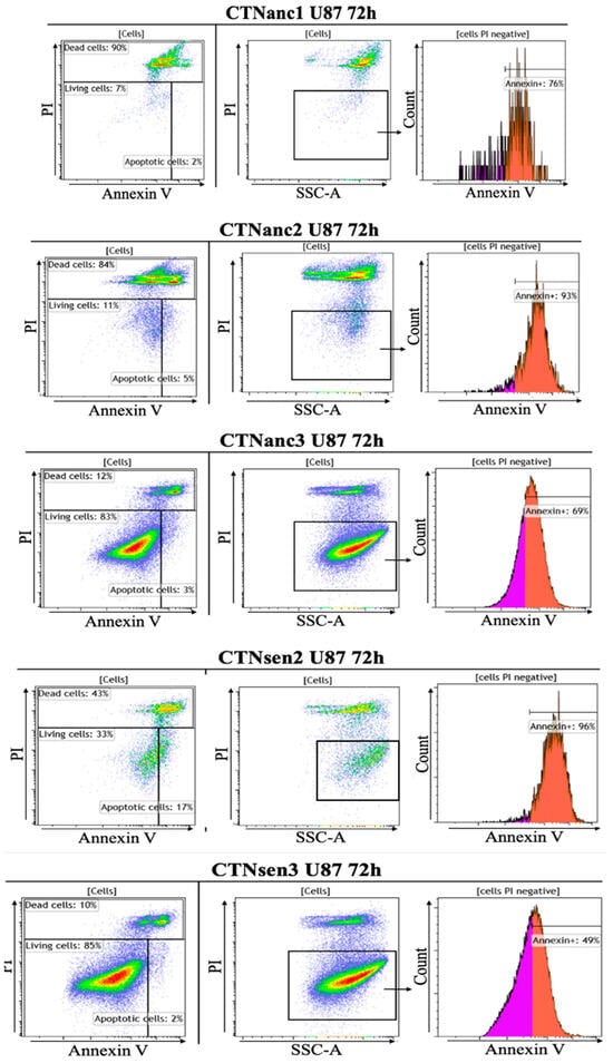 Notably, CTNsen2 also exhibited considerable cytotoxicity, reducing cell viability to 33%, though it was not as extreme as CTNanc1 and CTNanc2 when compared with the control untreated cells (Table 4 and Figure 14). However, treatment of U87 cells with CTNsen2 showed the highest Annexin V Mean Fluorescence Intensity (MFI) and 96% of the cells were Annexin V-positive (Table 5), compared to untreated cells. This suggests that CTNsen2 induces cytotoxicity leading to the apoptotic stage after 72 h.