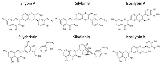 Silymarin (Silybum marianum) is the primary active compound extracted mainly from the seeds of the milk thistle, a thorny herb from the Asteraceae family. It has been widely studied for its potential in treating liver diseases [136,137]. The health benefits of milk thistle are largely attributed to silymarin, a complex composed of several flavonolignans such as silybin A, silybin B, isosilybin A, isosilybin B, silydianin, and silychristin (Figure 2). Additionally, silymarin contains flavonoids like quercetin and polyphenols. Among these, silybins are the most bioactive compounds, comprising 50–60% of silymarin, with the highest bioavailability. Despite its bioactive potential, silymarin is a highly hydrophobic molecule with low bioavailability, largely due to its rapid liver biotransformation and short half-life of six hours [138]. Beyond its hepatoprotective properties, guarding against liver diseases such as toxin-induced liver damage, viral hepatitis, cirrhosis, and hepatocellular carcinoma [139,140], silymarin has also demonstrated antioxidant, antifibrotic, anti-inflammatory, choleretic, immune-stimulating, regenerative, cytoprotective, cardioprotective, neuroprotective, and anti-carcinogenic effects [141].