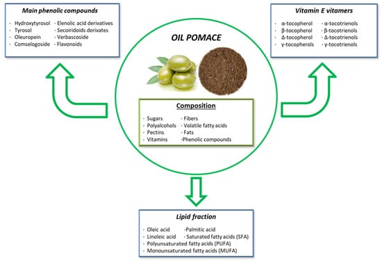 Olive pomace contains crushed olive stones, pulp, skins, and varying amounts of water, depending on the oil extraction method used. It is rich in phytochemicals, including vitamin E vitamers, phenolic compounds, peptides, quercetin, and fats (Figure 4) [202]. The most important vitamin E vitamer is α-tocopherol, the most abundant and biologically active form of vitamin E present in olive pomace. It plays a crucial antioxidant role by scavenging ROS and preventing lipid peroxidation. Apart from α-tocopherol, olive pomace contains seven other important vitamers: β, δ, and γ-tocopherols, and α, β, δ, and γ-tocotrienols [203].