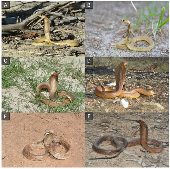 Phenotypic variation and hooding behavior in the Cape cobra (Naja nivea). The top row shows juveniles (A,B); adults are shown in middle and bottom rows (C–F). Specimens in (C,D) display the widespread yellowish to brown coloration, (E) shows a speckled specimen, and a dark brown variety is shown in (F). Images by Andries Cilliers.