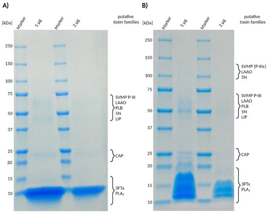 One-dimensional SDS-PAGE of Naja nivea venom under (A) reduced and (B) non-reduced conditions. Shown are stained protein bands of 5 µg and 2 µg venom. Putative toxin classes matching the molecular weight of the retrieved bands are assigned based on their known sizes. Abbreviations: svMP P-III = snake venom metalloproteinases of class P-III; LAAO = l-amino acid oxidase; PLA2 = phospholipase A2; PLB = phospholipase B; CE = carboxylesterase; 5N = 5′-nucleotidase; CRISP = cysteine-rich secretory proteins; 3FTx = three-finger toxins.