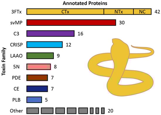 - Vanuopadath, M.; Raveendran, D.; Nair, B.G.; Nair, S.S. Venomics and Antivenomics of Indian Spectacled Cobra (Naja naja) from the Western Ghats. Acta Trop. 2022, 228, 106324. [Google Scholar] [CrossRef]