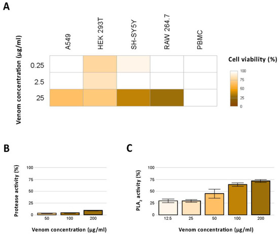 In vitro effects of N. nivea venom. (A) The heatmap shows the cytotoxic effect of the analyzed N. nivea venom on the viability of the five tested cell lines (A549, HEK 293T, SH-SY5Y, RAW 264.7, PBMC). (B) Protease and (C) phospholipase A2 activity. The bar charts illustrate the photometrically determined protease and PLA2 activity of N. nivea venom at three concentrations relative to the trypsin control, and at five concentrations relative to the PLA2 stock solution provided with the assay kit, respectively.