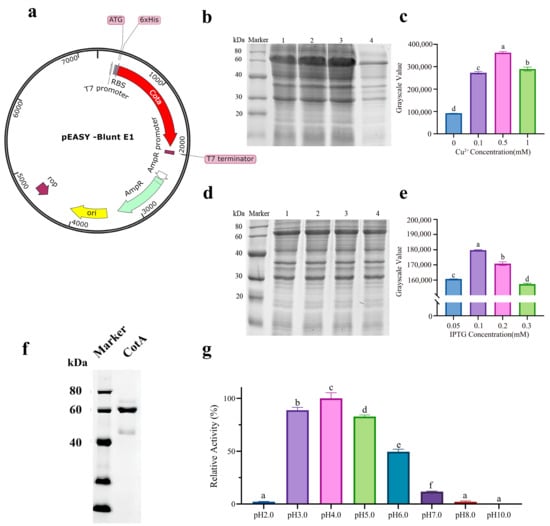 Expression optimization, purification, and characterization of rCotA: (a) Construction of the pEASY-Blunt E1-cotA plasmid. (b) SDS-PAGE analysis showing rCotA expression with varying IPTG concentrations. Lane 1: 0.05 mM IPTG; Lane 2: 0.1 mM IPTG; Lane 3: 0.2 mM IPTG; Lane 4: 0.3 mM IPTG. (c) Densitometric analysis of the SDS-PAGE gel bands for IPTG induction. Different lower-case letters indicate a significant difference between the two groups (p < 0.05). (d) SDS-PAGE analysis of rCotA expression with different Cu2+ concentrations. Lane 1: 0.1 mM Cu2+; Lane 2: 0.5 mM Cu2+; Lane 3: 1.0 mM Cu2+; Lane 4: 0 mM Cu2+. (e) Densitometric analysis of SDS-PAGE gels for Cu2+ induction. Different lower-case letters indicate a significant difference between the two groups (p < 0.05). (f) SDS-PAGE analysis of purified rCotA showing a single band at 60 kDa. (g) Enzymatic activity of purified rCotA at different pH levels (2.0–10.0) using ABTS as a substrate. Different lower-case letters indicate a significant difference between the two groups (p < 0.05).