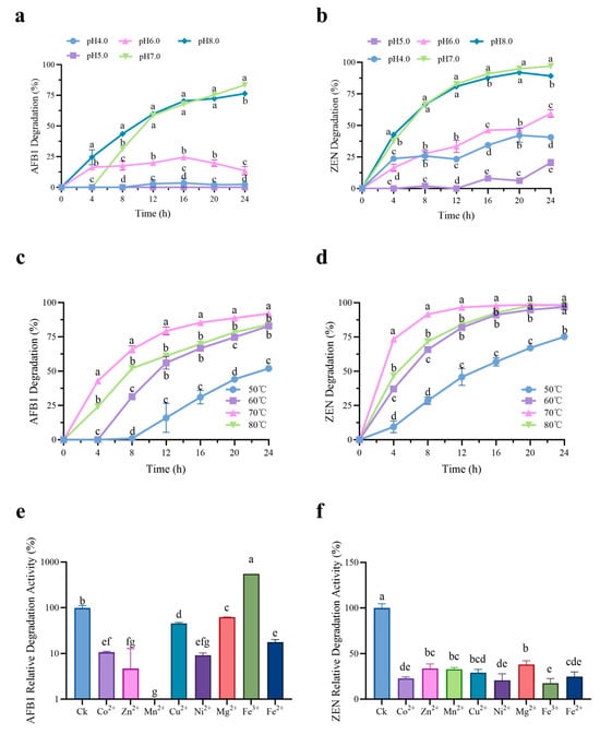 Degradation efficiency of AFB1 and ZEN by rCotA under varying conditions. (a) Time-course analysis of AFB1 degradation by rCotA at different pH. (b) Time-course analysis of ZEN degradation by rCotA at different pH. (c) Time-course analysis of AFB1 degradation by rCotA at different temperatures. (d) Time-course analysis of ZEN degradation by rCotA at different temperatures. (e) Time-course analysis of AFB1 degradation by rCotA with different metal ions. (f) Time-course analysis of ZEN degradation by rCotA with different metal ions. The results are presented as the mean ± SD of three independent experiments. Different lower-case letters indicate a significant difference between the two groups (p < 0.05).