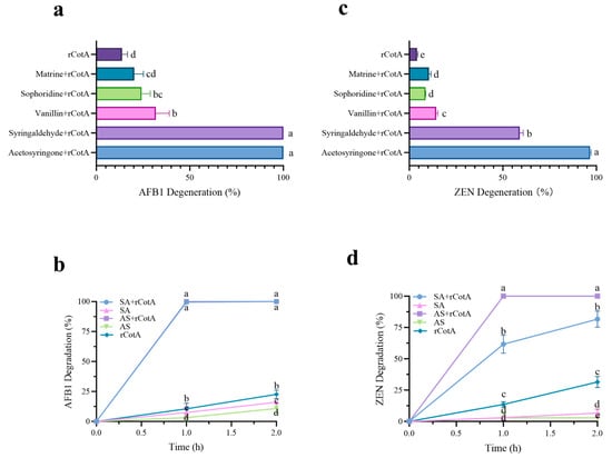 The effect of various mediators on the degradation of AFB1 and ZEN by rCotA. (a) AFB1 degradation rates in different rCotA mediator systems. (b) ZEN degradation rates in different rCotA mediator systems. (c) Time-course analysis of AFB1 degradation rates in the acetosyringone– and syringaldehyde–rCotA mediator system. (d) Time-course analysis of ZEN degradation rates in the acetosyringone– and syringaldehyde–rCotA mediator system. The results are presented as the mean ± SD of three independent experiments. Different lower-case letters indicate a significant difference between the two groups (p < 0.05).