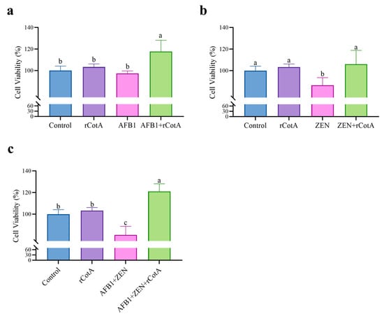 Detoxification effect of rCotA on AFB1 and/or ZEN in Raw 264.7 cells. (a) Detoxification effect of rCotA on AFB1 compared to the PBS-treated group. (b) Detoxification effect of rCotA on ZEN compared to the PBS-treated group. (c) Detoxification effect of rCotA on “AFB1 + ZEN” compared to the PBS-treated group. The results are presented as the mean ± SD of three independent experiments. Different lower-case letters indicate a significant difference between the two groups (p < 0.05).